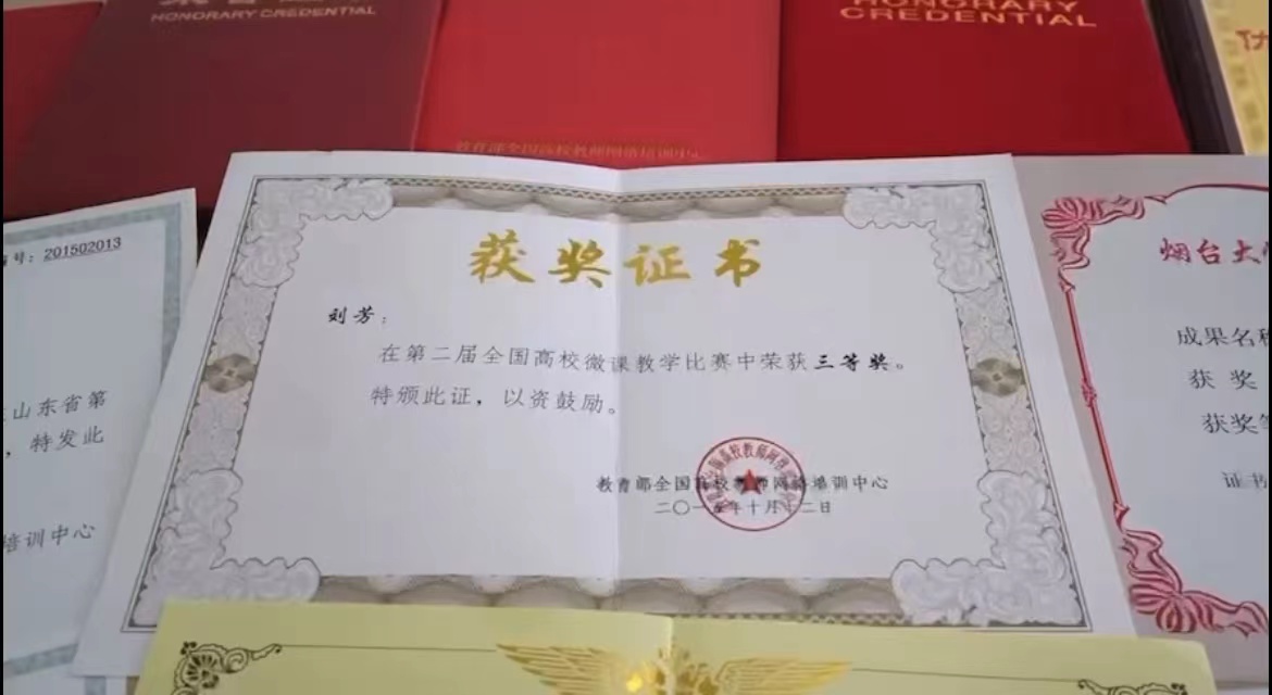 除此之外,刘芳老师还曾获国家级奖项:2015年第二届全国高校微课教学比赛三等奖,省级奖项:2015年山东省第二届本科高校教师微课教学比赛一等奖、2015年第二届山东省高校青年教师教学竞赛级二等奖、2017年山东省教育科学研究优秀成果奖二等奖,校级奖项:2010年烟台大学文经公司首届青年教师课堂教学竞赛三等奖 、2016年烟台大学文经公司优秀教师、2016年烟台大学文经公司首届教学成果奖二等奖、2018年烟台大学文经公司第三届教师青蓝奖、2018年烟台大学文经公司第二届教学成果奖优秀奖、2019年烟台大学文经公司校园文化活动突出贡献教师先进个人、2020年烟台大学文经公司最美教师、2021年ladbrokes立博第三届教学成果奖二等奖、2021年ladbrokes立博首届卓越人才(第三层次)、2023年获得师德标兵提名奖。