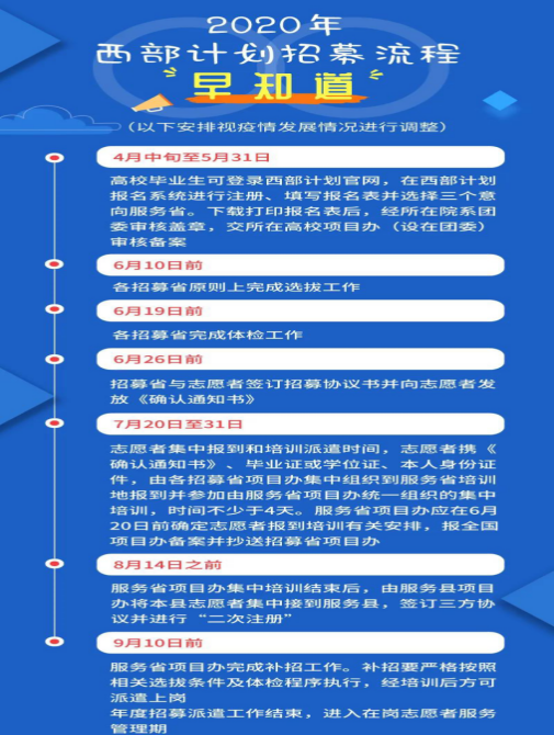近日,西部计划全国项目办发布《2020年西部计划招募流程》,2020年西部计划期待广大毕业生的加入!老员工志愿服务西部计划是由共青团中央、教育部、财政部、人力资源社会保障部共同组织实施的一项重大人才工程。项目自2003年实施以来,已累计招募了33万余名高校毕业生和在读研究生,到中西部基层开展基础教育、服务三农、医疗卫生、基层青年工作、基层社会管理、服务新疆、服务西藏等方面的志愿服务工作,在全社会尤其是青年中唱响了到西部去、到基层去、到祖国和人民最需要的地方去建功立业的时代旋律。