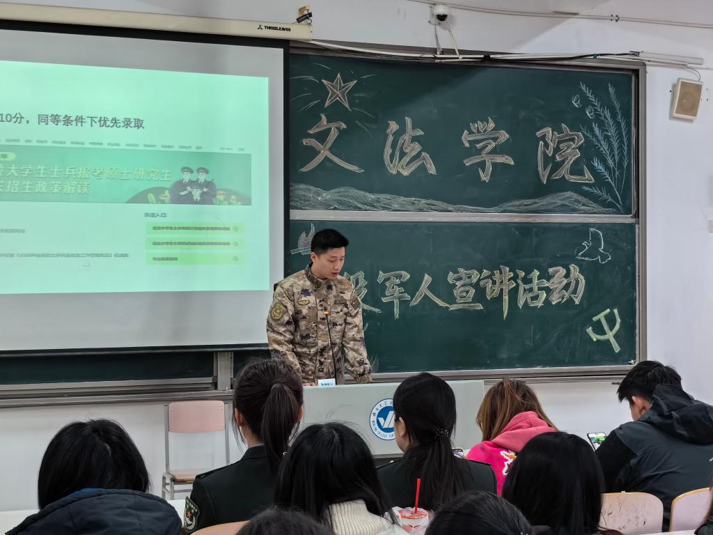 宣讲活动中,张立冬和李佳同学从入伍条件、入伍流程和入伍政策等方面向同学们讲解了征兵入伍的相关信息,张霖同学通过自己军旅生活中的成长磨炼和美好的战友情向同学们展示了军营生活的独特魅力。本次讲座现场气氛活跃,三位同学的演讲生动形象,情感真挚,获得了台下同学们的热烈反响。