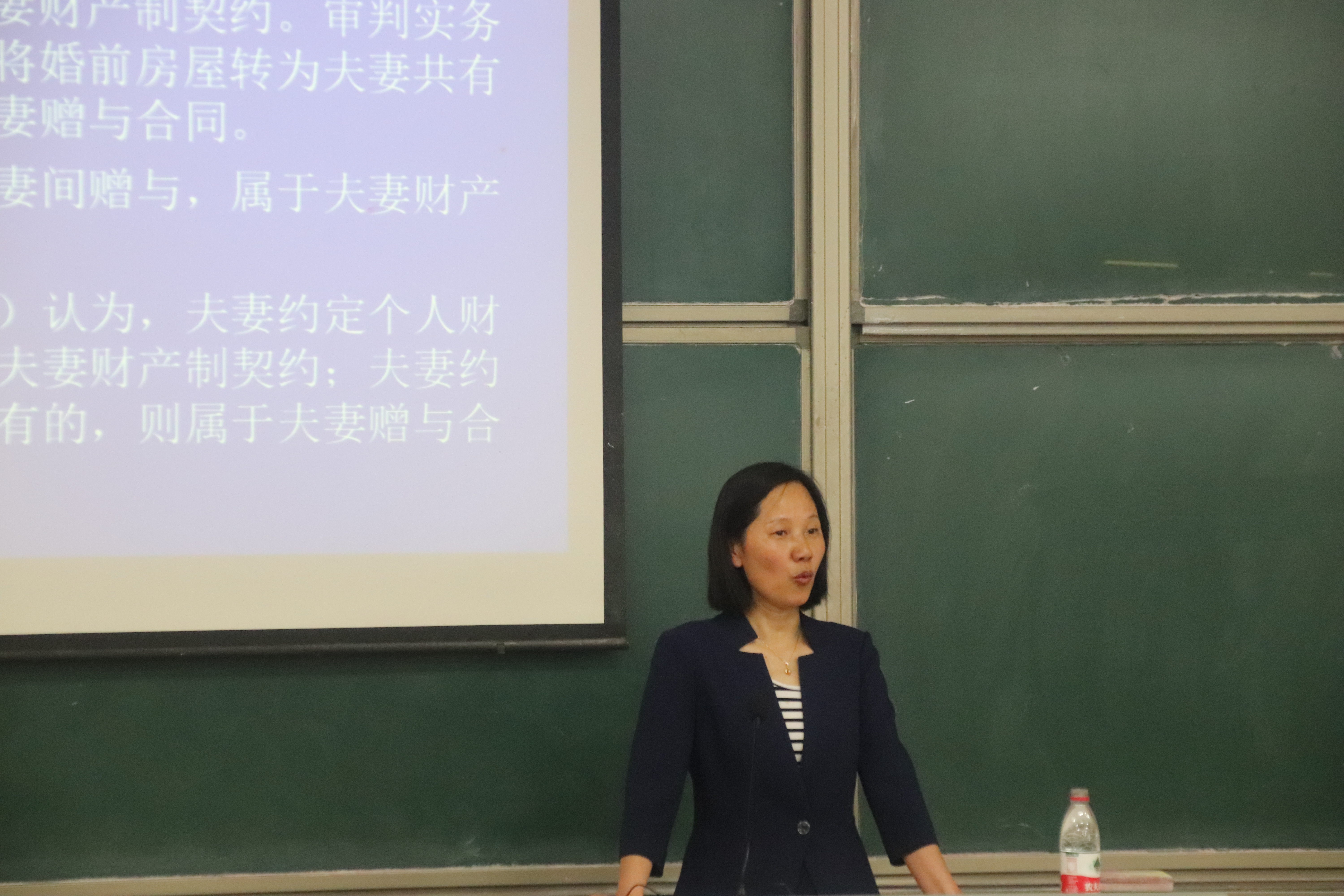 讲座由阐述“合同与契约”和“合同与协议”的异同展开,范李瑛教授结合事实案例和不同学者的观点,迅速将所有员工带入讲座的气氛中。她指出夫妻财产制契约不仅具有身份性质,也具有财产性质,并且基于民事法律行为而致物权变动。结合生动的案例,范教授将婚姻法上的夫妻财产制和民法中的物权法结合起来,对两者的适用问题作简要分析,又在此基础上分成三个模块,分别从性质、依据和选择三个角度切入。讲座全程,范教授语言生动,讲解细致,从多角度剖析问题的本质,使在座师生深刻领悟了夫妻财产制所致物权变动的法律原因和法律后果。