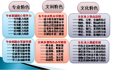 对于2015年-2019年人文艺术专业群建设的经验、成果和特色,我们已进行了比较全面的总结梳理工作,为未来三年建设提供了坚实基础。这就是:实现“专业特色、文科特色、文化特色”三大方面的改革效能,包括一是突出专业群的文化传承、素质培养、创新改革功能;二是达成双向性的内力外力、课内课外、校园社会联动;三是建构文科类横跨专业、外联行业、融通课程机制。
