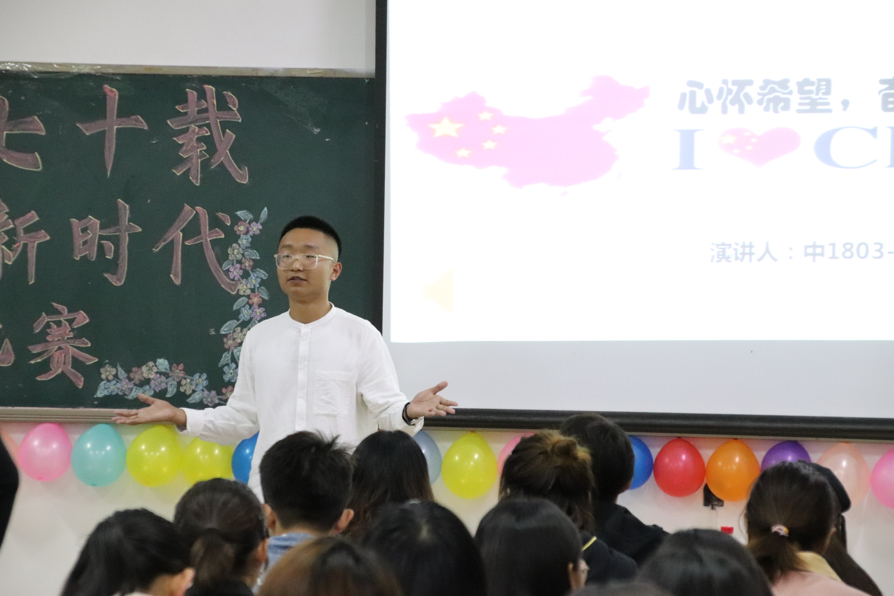 为庆祝新中国成立70周年,激励和引导广大青年弘扬爱国主义精神,肩负起时代赋予的崇高使命,10月12日晚,中文与法律系于一教118举办了“峥嵘岁月七十载,青春献礼新时代”演讲比赛。文法系团总支书记陈秀慧,2019级辅导员裴鹤,中1903-1班主任李金蔓及员工代表出席此次比赛。