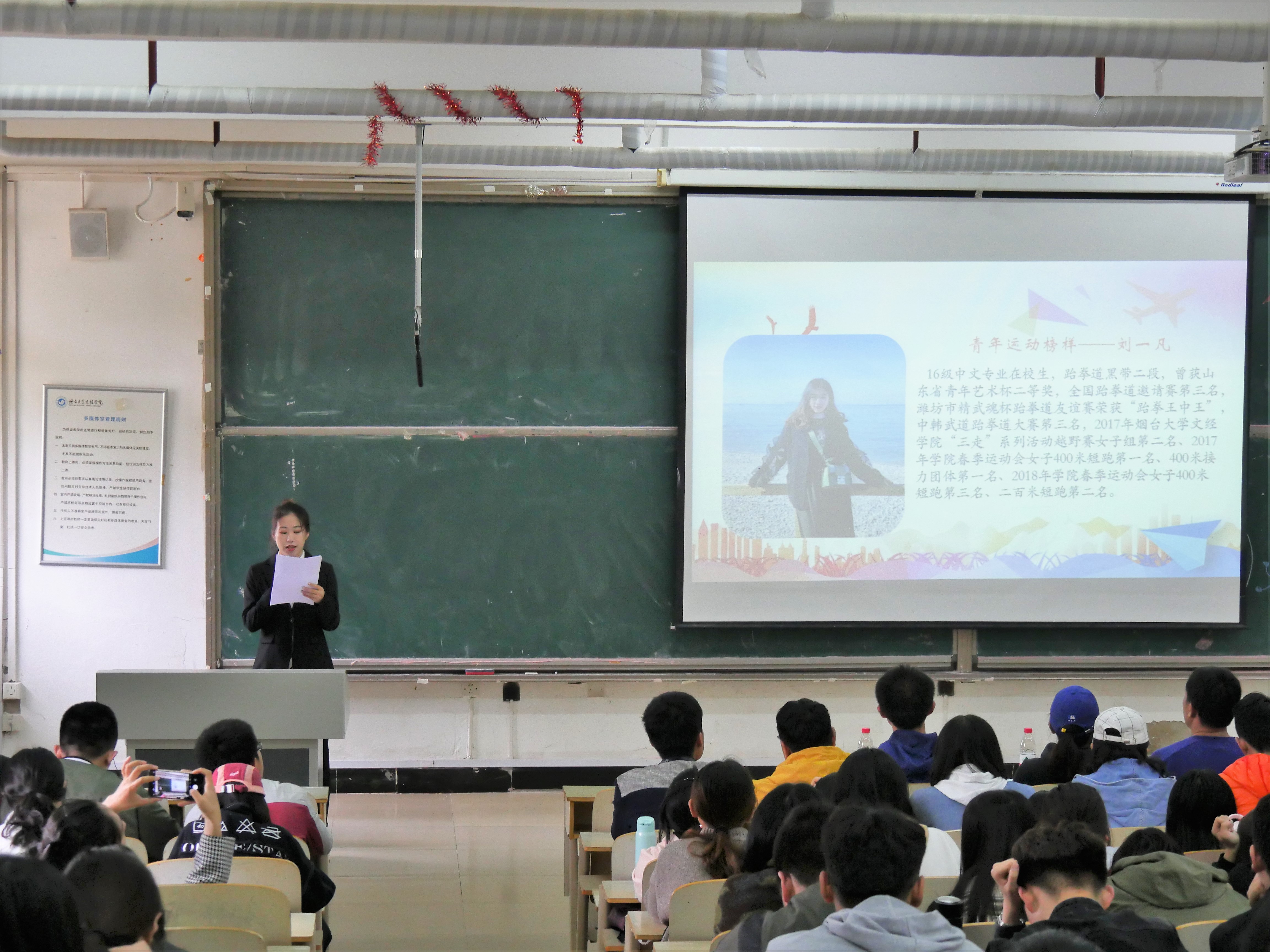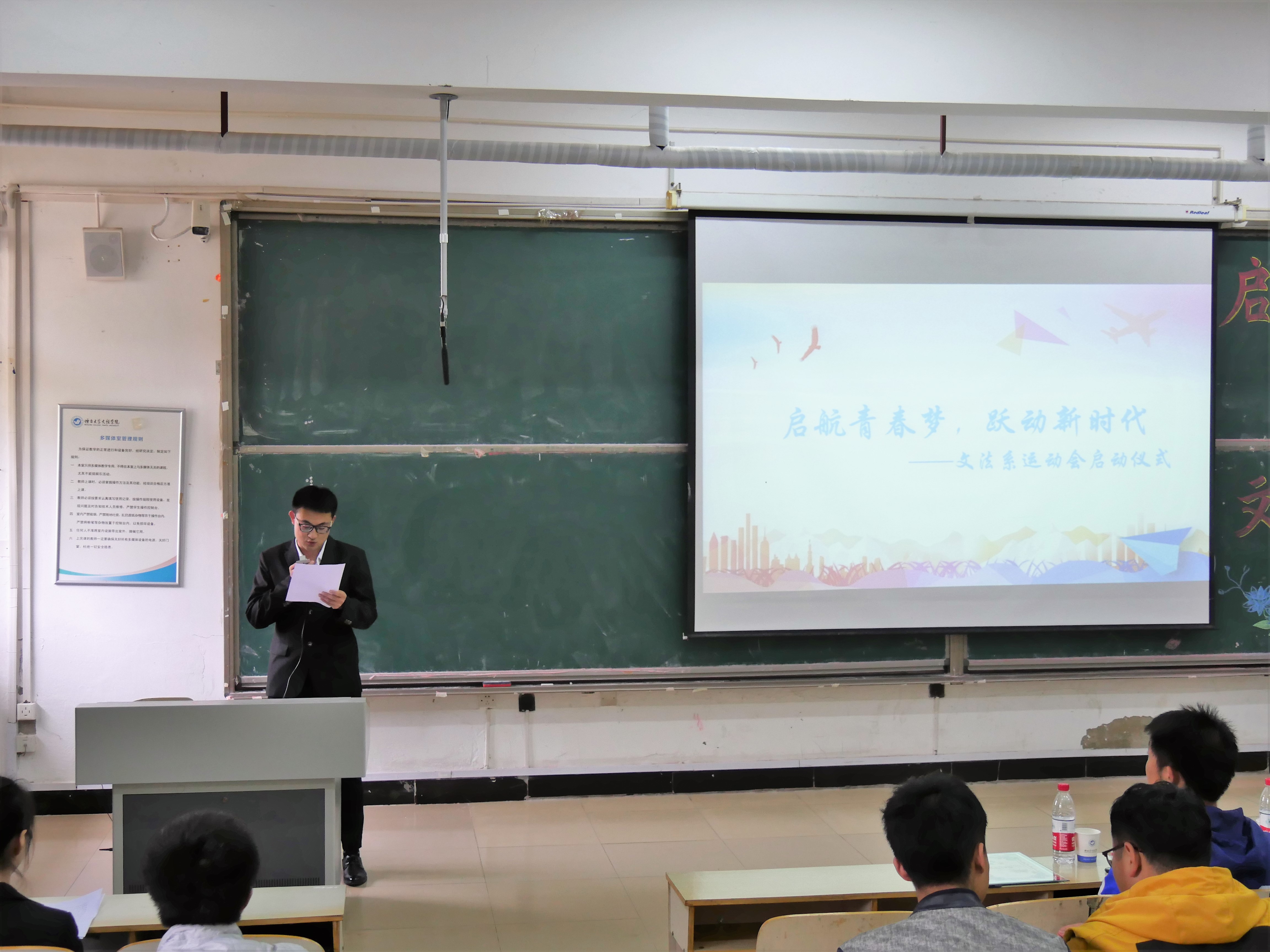 4月24日上午,文法系于一教106开展“启航青春梦,跃动新时代”2019年春季运动会启动仪式。公司体育教学部主任助理谢勇,体育教学部教师范存智、王焕珍受邀担任嘉宾,文法系党总支书记曹钊庆出席,团总支书记陈秀慧主持本次启动仪式。