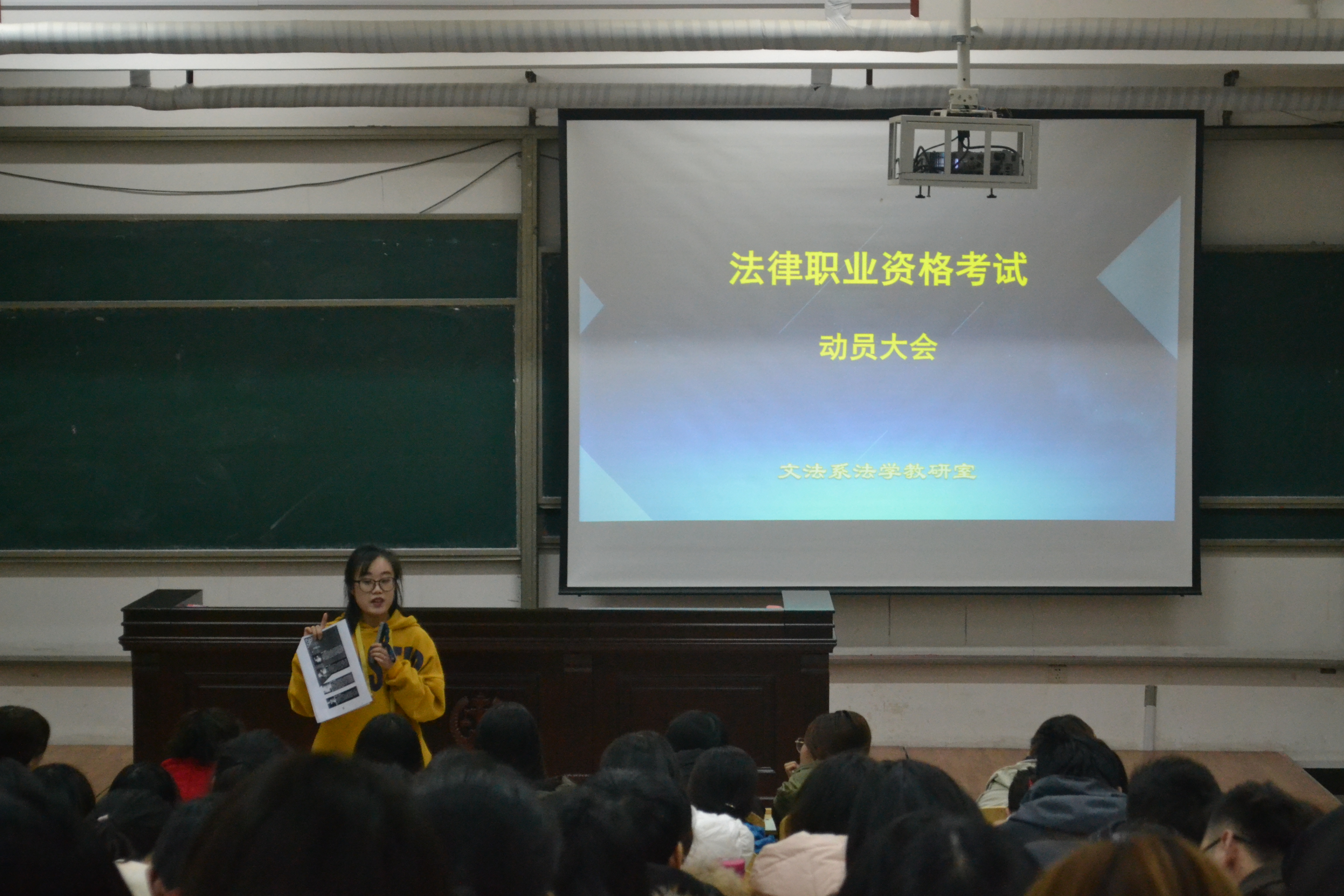 为了让同学们加深对法律职业资格考试的了解和重视程度,使今后的学习更有目的性和针对性,11月27日晚,文法系于一教506面向2015级法学专业学子召开法律职业资格考试动员大会,文法系法学教研室主任吴淑霞及法学教研室全体教师出席大会。