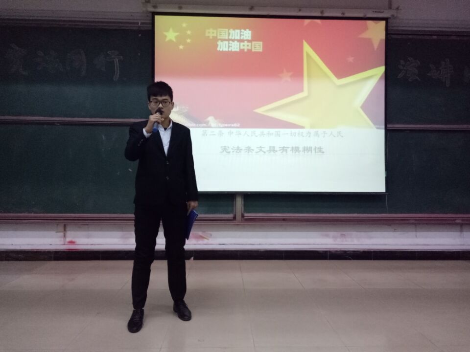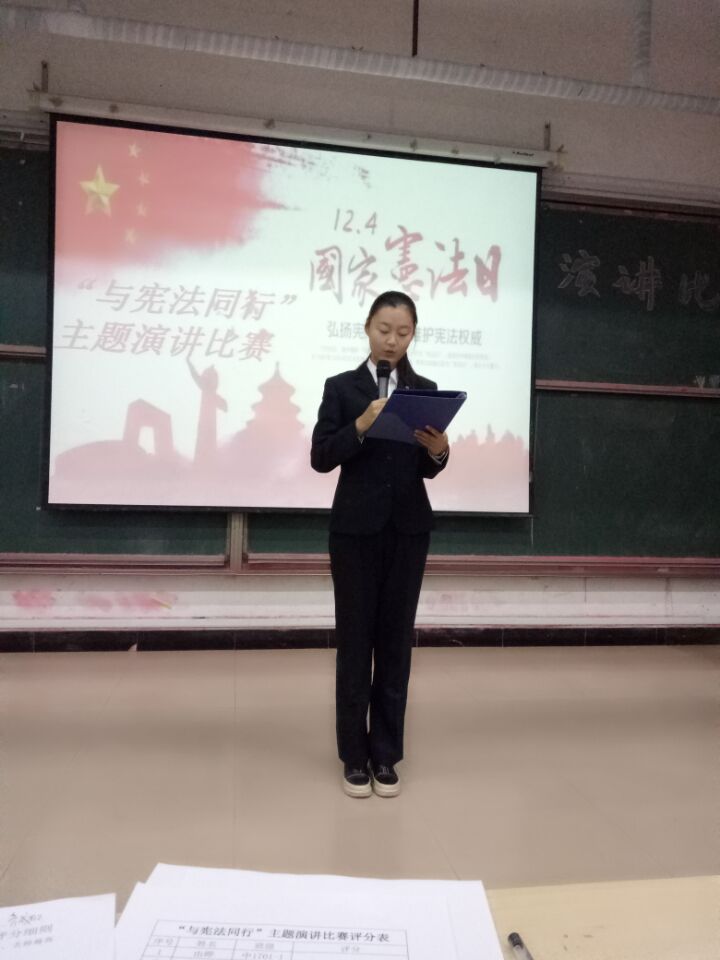 此次活动于12月4日下午4点在一教101成功举办。在此次“与宪法同行”演讲比赛中,13名法学学子做了认真充分的准备,演讲基调或慷慨激昂,或条理清晰。每个人都从自己的角度去解读宪法,各位选手表现精彩、各有所长,其清晰条理的演讲思路展现了法学学子严谨、崇法的专业态度和法科生应有的素质与思维,判断与激情。最终,中1701-2班刘书鑫夺得本次比赛一等奖,中1701-2班成晓悦获得二等奖,中1701-1班由晔,中1701-2班邓燕茹获得本次比赛三等奖。