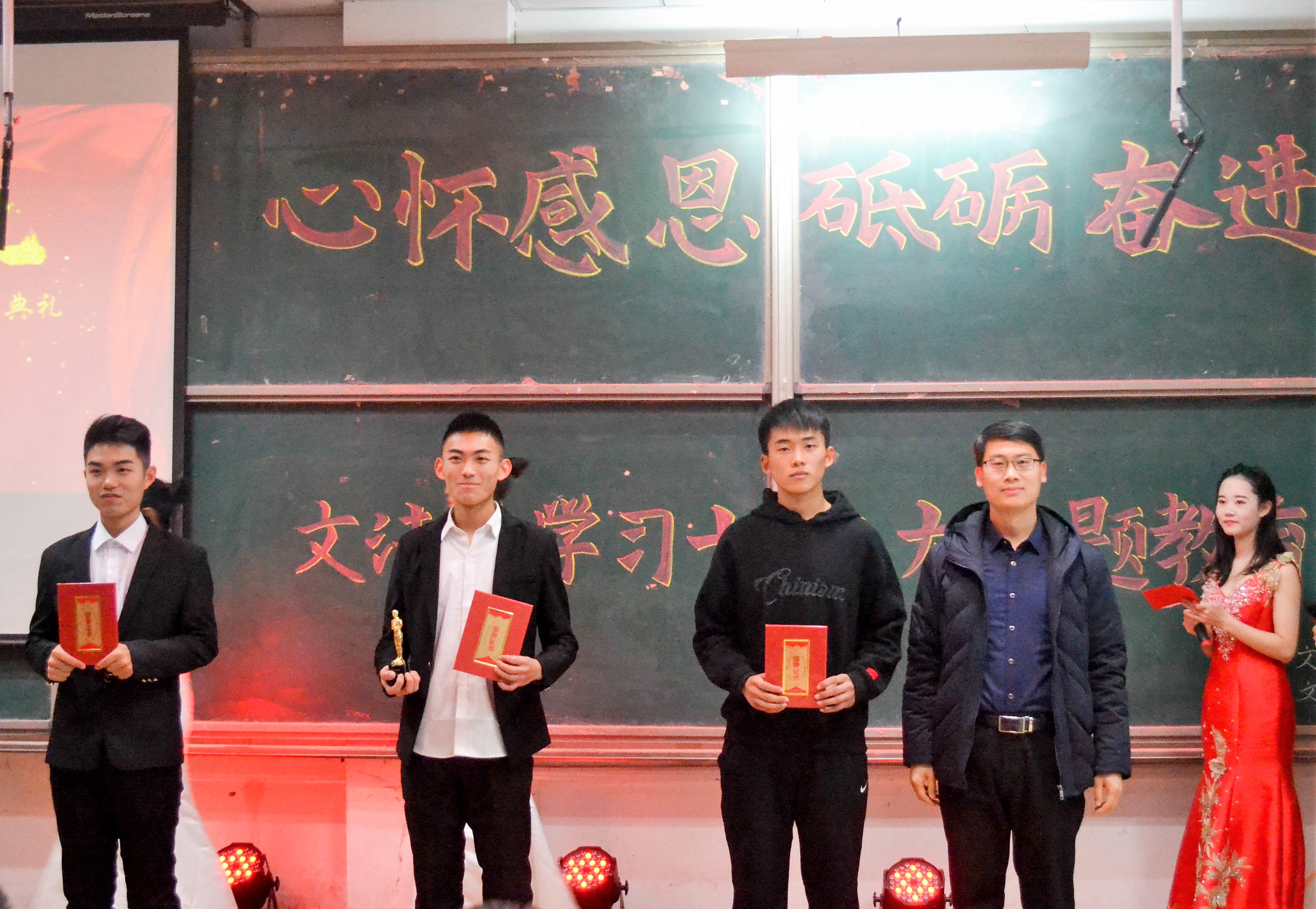 本次主题活动分为“不忘初心、感恩前行”,“砥砺奋进、继往开来”,“青春飞扬、致敬十九大”三个篇章。活动在感人肺腑、铿锵有力的朗诵《感恩,从文法开始》中正式拉开帷幕,哑剧《母与子》和话剧《迟来的爱》演员们用精湛的演技和全身心的投入让现场观众发自内心的被震撼,令人动容。舞蹈《礼仪之邦》则展现了传统服饰以及传统舞蹈的魅力,《我的梦,中国梦》合唱更是以豪迈的时代乐章表达了青年学子不忘初心砥砺奋进的决心。活动期间还对感恩月主题系列活动中“最感恩”感动人物、“心系文法”感恩话剧比赛、“为你写诗”感恩诗词创作大赛的获奖人员进行颁奖。最后曹钊庆副书记进行总结讲话,他带领同学们回顾了党十八大以来的辉煌成就,分析解读党的十九大精神的重要意义。他希望同学们不仅要对父母国家心怀感恩,更要坚定自觉地用习近平新时代中国特色社会主义思想为指导,将自己的青春梦融入伟大的中国梦,做最有朝气、最有活力、最具创造精神的中国青年。