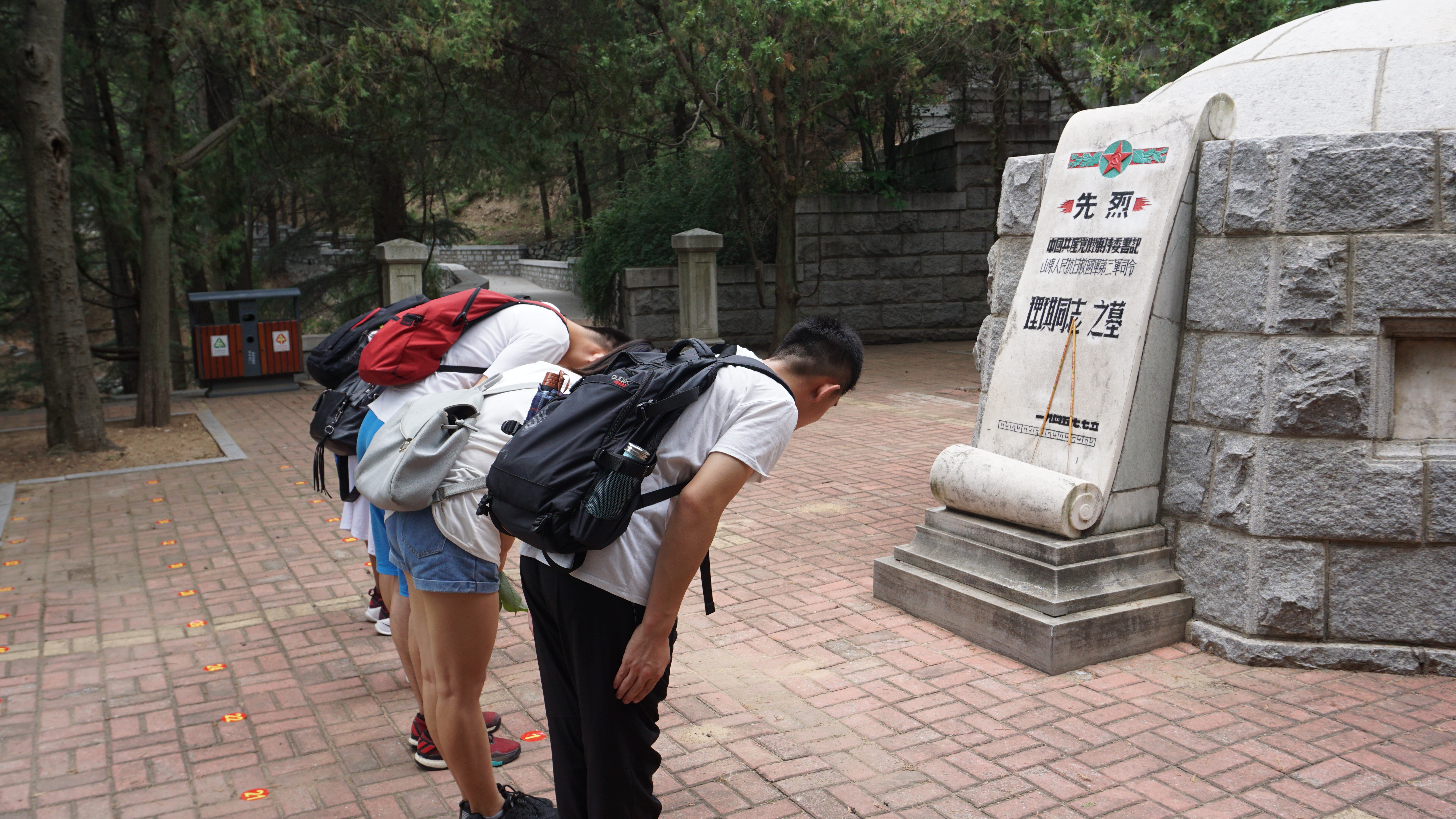 7月15日,实践队一行来到栖霞英灵山进行调研。队员们首先参观了烈士陵园,了解革命先烈的光荣事迹,体悟先烈们的革命精神。一路上看到了烈士墓、群英亭等,队员们认真的阅读烈士们的生平事迹,在烈士纪念堂后面不远的地方,绿树鲜花,簇拥着一座石砌圆顶大墓,墓前悬垂着大理石雕成的白色卷轴,上面刻着:“中共胶东特委书记、山东抗日救国军(第三军)司令理琪同志之墓”。队员们进行了祭拜,表达对理琪同志深深地敬意。青山埋忠骨,马革裹尸还,一个个叩响历史的名字,一个个浴血奋战的场景,一些永不褪色的回忆,一段铸就国魂的历史……每一次提起他们都是一种激励。