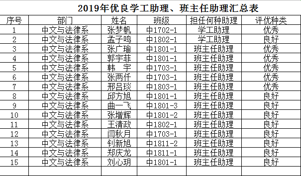 通过对文法系2019-2020学年20位助理过去一年工作表现,同时政治思想表现好,过去一年无违纪行为;热爱工作,责任心强,业务素质高,有较强团队意识,积极主动参与所带班级及助班军训、入学教育活动,及时迅速落实公司工作部署;带班工作优秀,所带班级班风正、学风浓、凝聚力强,无重大违纪现象;勤奋学习,刻苦钻研,学习成绩良好,上个学期无挂科现象等条件。经广泛征求辅导员、班主任的意见基础上进行了评选,其中符合以上条件的共有15位同学,分别包括2位学工助理5位优秀班主任助理、8位良好班主任助理。评选结果如下: