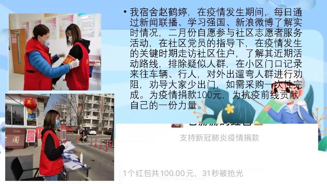 辅导员及班主任引导各班级团支部通过抗“疫”专题学习、理论宣讲、问答讨论、等多种活动形式组织开展此次主题班会。各班凝练“疫情防控思政大课”授课精华,从爱国主义教育、责任担当教育等多角度引领员工深刻感悟中国抗疫彰显的中国共产党领导和中国特色社会主义制度的显著优势,与祖国同命运;讲述战“疫”中的平凡故事,通过分享典型抗“疫”人物事迹,感受最美“逆行者”带来的温暖,引导员工在感悟中勇当时代先锋;组织员工分享自己的抗“疫”故事和感想,讲述亲身参与“防疫战”的所见所闻,学习乐于奉献、不求回报的精神,激励班级同学勇敢前行,谱写壮美的青春篇章。