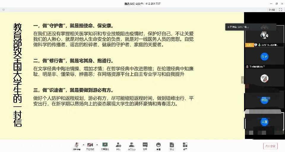 其中,中1602-2班发挥中文专业人文情怀,共同回顾了战“疫”期间相关感人事迹,关心理解战斗在防疫一线的医护工作者、奉献者。在关注疫情的同时,班主任刘芳也就2020届毕业生实习、论文写作、就业等情况进行了相关解答,叮嘱员工做好合理规划,调整好心态,共同打赢疫情防控阻击战。
