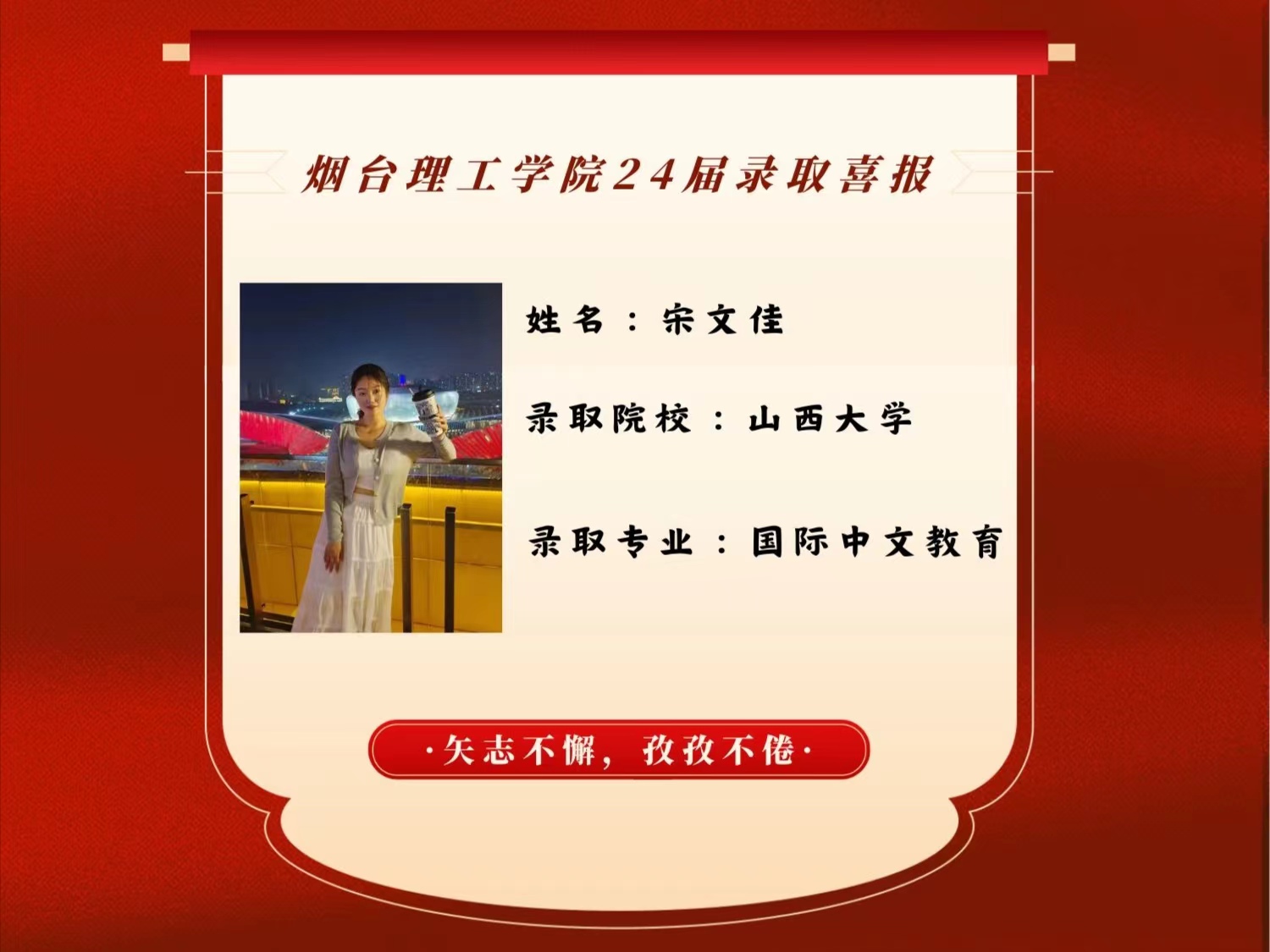 近日,ladbrokes立博学子宋文佳考研上岸山西大学。宋文佳同学曾获得2022-2023学年“优秀共青团干部”、2021-2022“优秀共青团干部”、2022年度山东省高等公司省级“优秀员工”、2024年“优秀毕业生”。