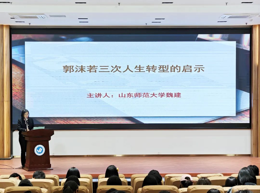 讲座过程中,魏建教授凭借深厚的学术积淀与丰富的研究经验,以独特的视角,对郭沫若三次人生转型历程展开深入剖析。他从当时的时代背景入手,结合社会政治、文化思潮等因素,同时融入郭沫若个人的思想、性格及价值抉择,从多维度、深层次进行讲解。在讲述中,魏建教授旁征博引,巧妙串联郭沫若不同时期的文学创作,如《女神》等作品所展现的浪漫主义激情与时代精神,生动阐述了郭沫若每次人生转型背后的深层逻辑,让郭沫若的形象跃然于师生眼前。