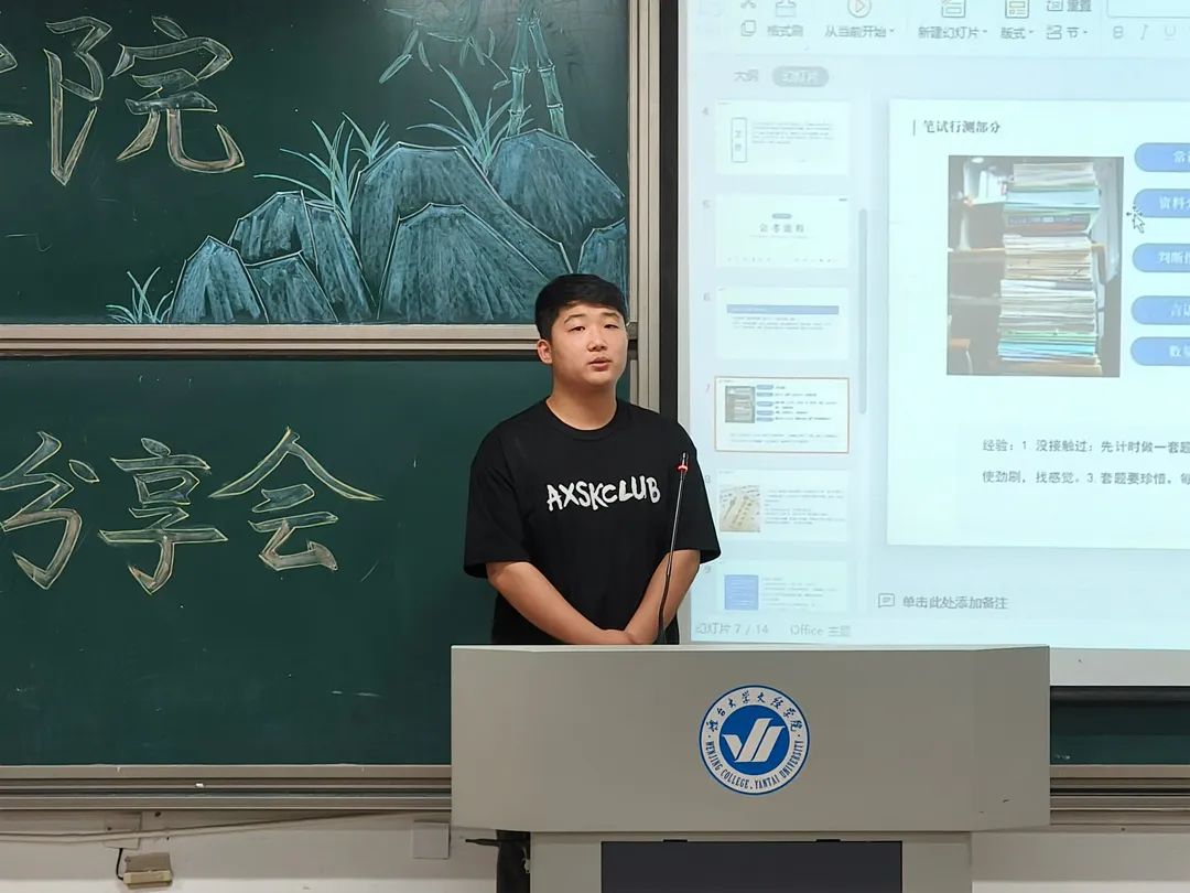 分享会上,王刚同学以“考公小白成‘公’之路”为主题,从自我认知、考公流程、笔试面试重点等方面展开分享。他通过能力评估表强调“适合才是硬道理”,梳理考公关键时间轴并传授选岗技巧,推荐行测申论备考名师及答题策略,还结合实战场景解析面试避坑要点。王昱程同学则聚焦自我认知与心态调整,建议明确考公动机、理性选岗,分享行测申论模块做题方法与素材积累技巧,强调面试需跳出模板展现个人特色,同时提醒同学合理规划学习、保持身心健康。