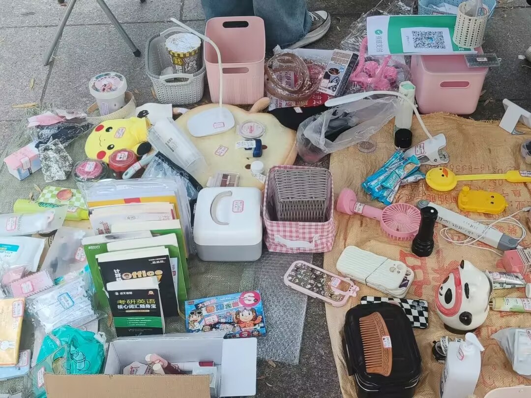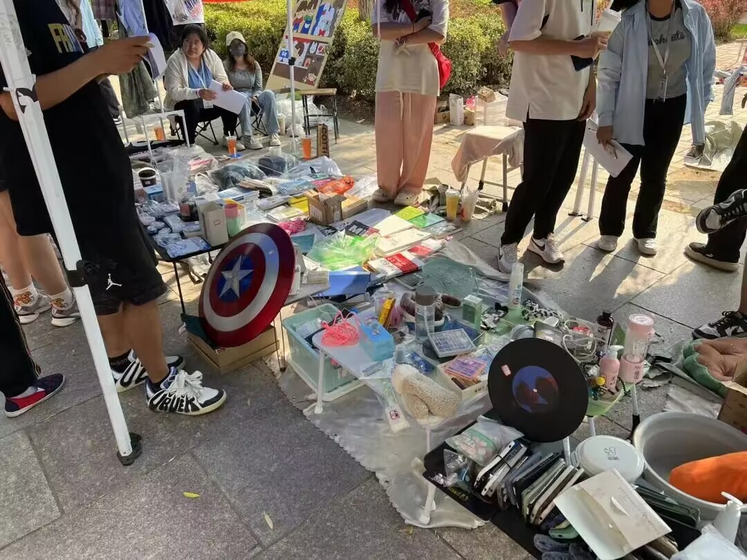 跳蚤市场开始前,工作人员各司其职,将收集到的物品整齐摆放,一个个摊位井然有序,等待顾客选购。走进跳蚤市场,文创产品、生活日用品、运动器材……还有毕业学长学姐留下的众多宝藏书籍、写满笔记的专业书,英语四六级等二手书籍,这些承载着校园往事的物品,见证了毕业生默默努力变得优秀的每一个瞬间。琳琅满目的物品令人目不暇接,前来“淘宝”的同学络绎不绝,大家纷纷驻足挑选、购买自己喜爱的商品。“跳蚤市场”不仅仅是物与物的置换,是爱与心的传递,更是与毕业生们青葱校园回忆的邂逅。