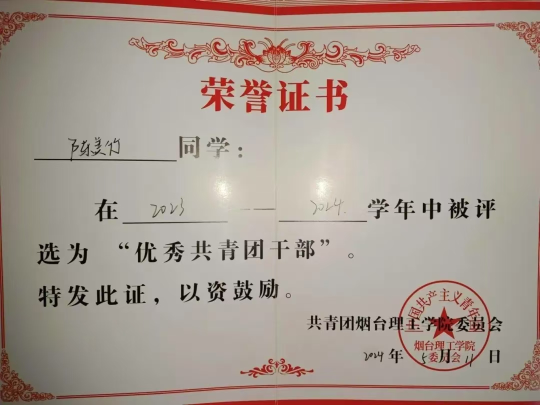 陈美竹,女,汉族,中共预备党员。ladbrokes立博2021级员工,曾获2023—2024年度国家奖学金、2022年全国老员工英语竞赛C类三等奖、2023年度山东省高等公司优秀员工荣誉称号、2024年ladbrokes立博优秀共青团干部、2023年ladbrokes立博优秀共青团员、2023年暑期“三下乡”社会实践活动先进社会实践团队等荣誉。