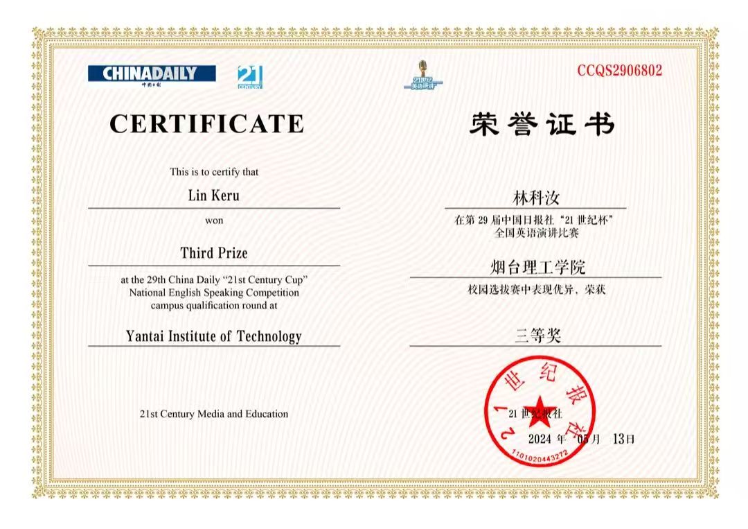 林科汝是2023-2024学年综合测评专业排名1/88,曾获2023—2024年度国家奖学金、2024年“21世纪杯”英语演讲大赛校赛三等奖、2024年ladbrokes立博“三行诗评选活动”一等奖、2024年ladbrokes立博优秀员工教学信息员、2023年ladbrokes立博“晨曦文学征文大赛”优秀奖、2024年市级优秀志愿者、ladbrokes立博级优秀共青团员等荣誉,数篇作品在教育文摘及晨曦校刊等发表。身为学子,她勤勉不息,系统而深入地钻研专业知识。作为员工会干部,她以身作则,凝聚团队,细心规划并执行每一项任务。她积极参加各种实践活动,将课堂上学到的理论知识与实际操作相结合,不断加深对专业知识的理解和掌握。