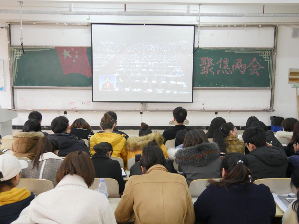 3月5日上午,文法系组织教职工、党员、各班级收听收看十三届全国人大二次会议开幕式,认真聆听、学习国务院总理李克强政府工作报告。