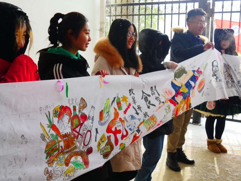 本届百米长卷艺术创作大赛的主题为改革开放四十周年之衣食住行的变化,文法系通过抽签选中的创作主题是“食”。文法系共有32位同学报名参赛,结合改革开放中人们在“食”方面的巨变在长卷上进行现场创作。小笼包、饺子、冰糖葫芦等传统美食活跃在画布上,年夜饭、油条豆浆、荷包蛋等引人垂涎,艺术字体“改革开放”令人惊艳。经过四个小时的共同努力,文法系参赛同学都交出了满意的作品。经过最后的投票评比,文法系荣获团体最具创意奖,文法系李奕君同学荣获三等奖,綦宗芃同学荣获优秀奖。