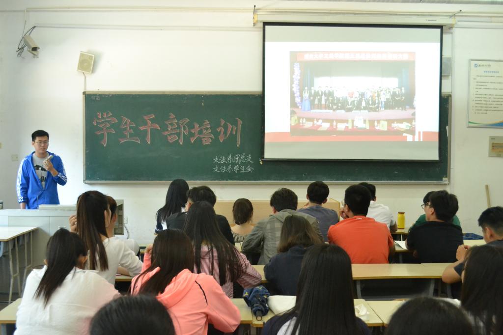 5月31日下午,文法系于一教214举办员工干部培训会,14级优秀毕业生崔永辉、荣蕾受邀担任嘉宾,文法系员工会主席团及各部部长出席,员工干部代表参加本次交流会。