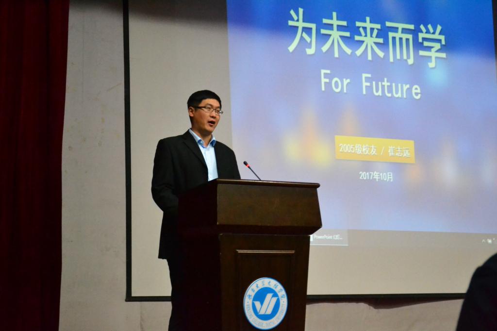 讲座伊始,崔志远围绕学习、做事、共处、生存四个方面展开讲座,引用九寨沟地震发生后人工智能以25秒合成新闻稿件的事例,表明现代科技发展和社会变化影响人才培养,点出"为未来而学"的主题。他告诫新时代老员工不要迷失于当下,并提供“旋转的陀螺”理解记忆法帮助员工更快适应新形势和新环境。随后,崔志远对照动态平衡的陀螺提出应对未来环境所需要的四种核心素质:学会学习就是动力,学会做事就是中轴,学会共处就是围环,学会生存就是支点。讲座尾声,崔志远指出“扬长决定最高水平,补短决定最低水位”,要求同学们扬长补短,全面发展,自我升华。