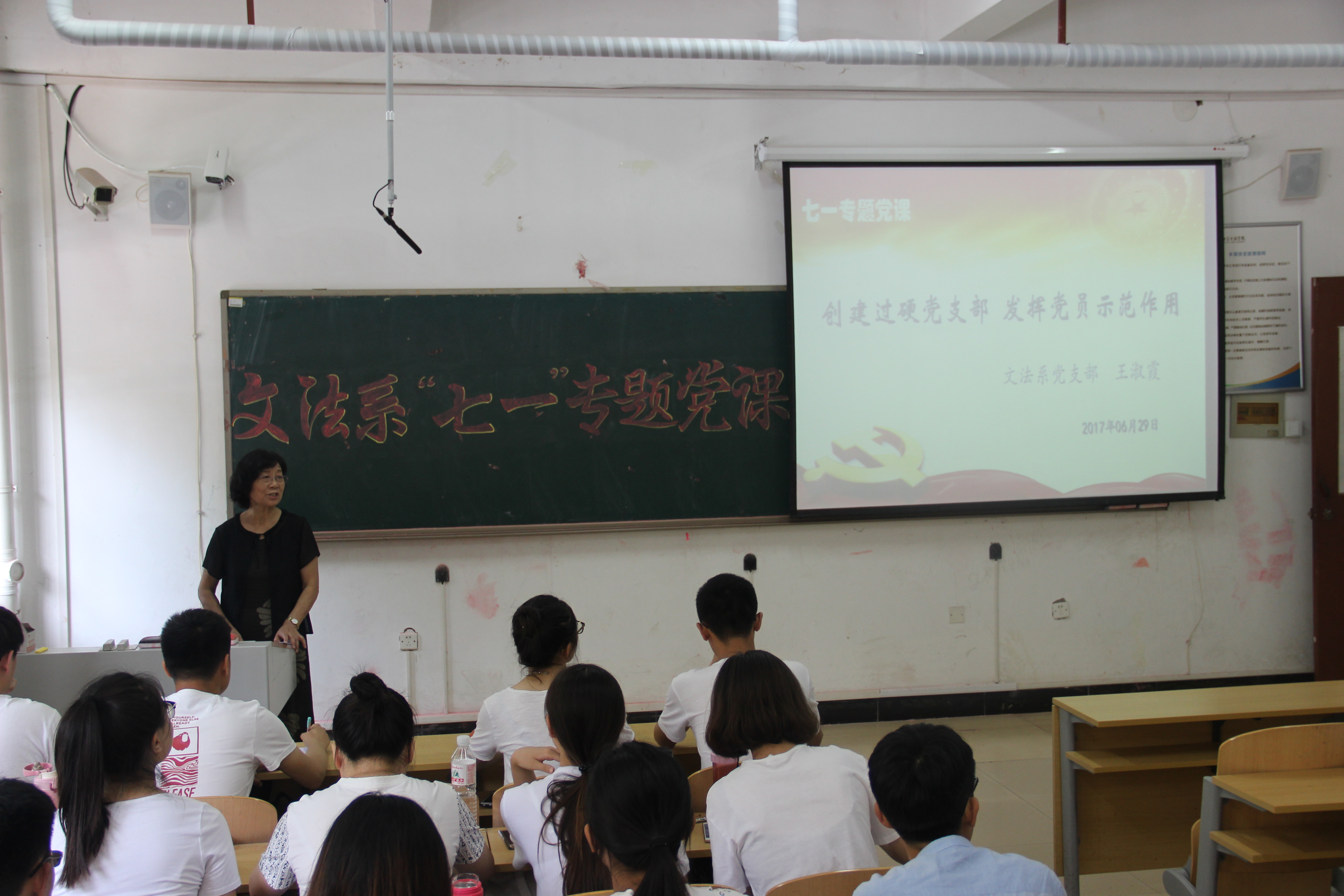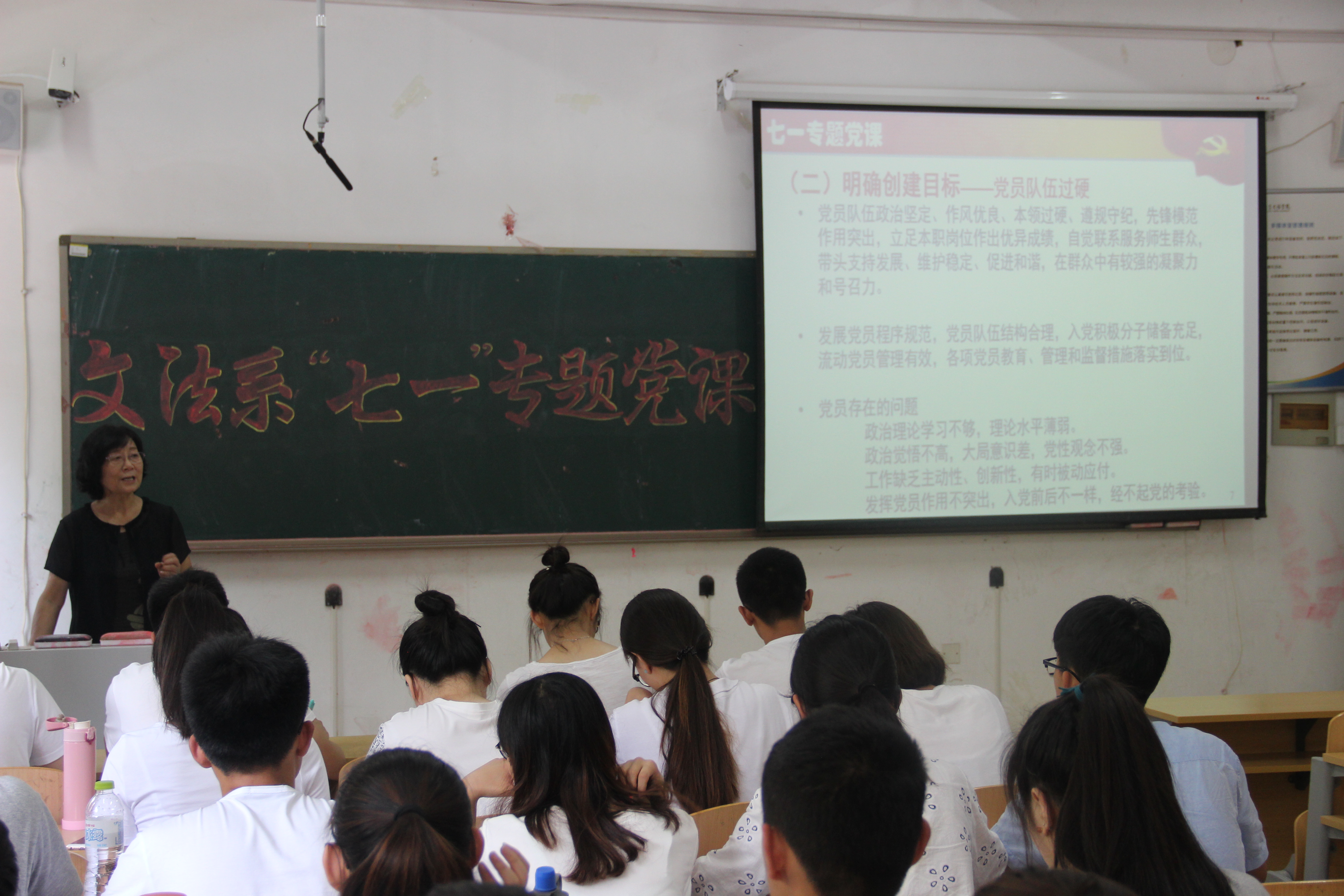 6月29日,文法系“七一”专题党课培训讲座在一教118举办。系党支部书记王淑霞给文法系员工党员、入党积极分子上了一场精彩的党课。