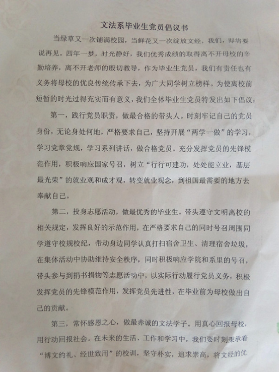 党员倡议如下:一、践行党员职责,做最合格的带头人。无论身处何地都要严格要求自己,坚持“两学一做”,学习党章党规,学习系列讲话,做合格党员。二、投身志愿活动,做最优秀的毕业生。做好带头示范作用,以自己的实际行动去号召每一位同学,在毕业之前为母校做出自己的贡献。三、常怀感恩之心,做最赤诚的文法学子。始终秉承“博文约礼,经世致用”的校训,把文经的优良传统发扬光大。同时,各位毕业生党员在倡议书上签字并展示于一教大厅内。