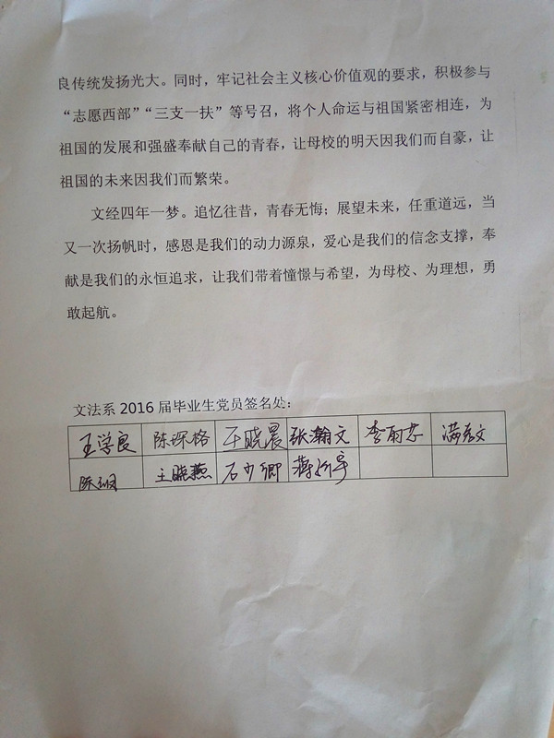 毕业季来临,为了使离校前短暂的时光更加充实而有意义,文法系全体毕业生党员特地发出倡议,鼓励大家以党员标准严格要求自己,做一名合格党员,并以党员身份号召大家在即将离校之际为母校做出自己的一份贡献。