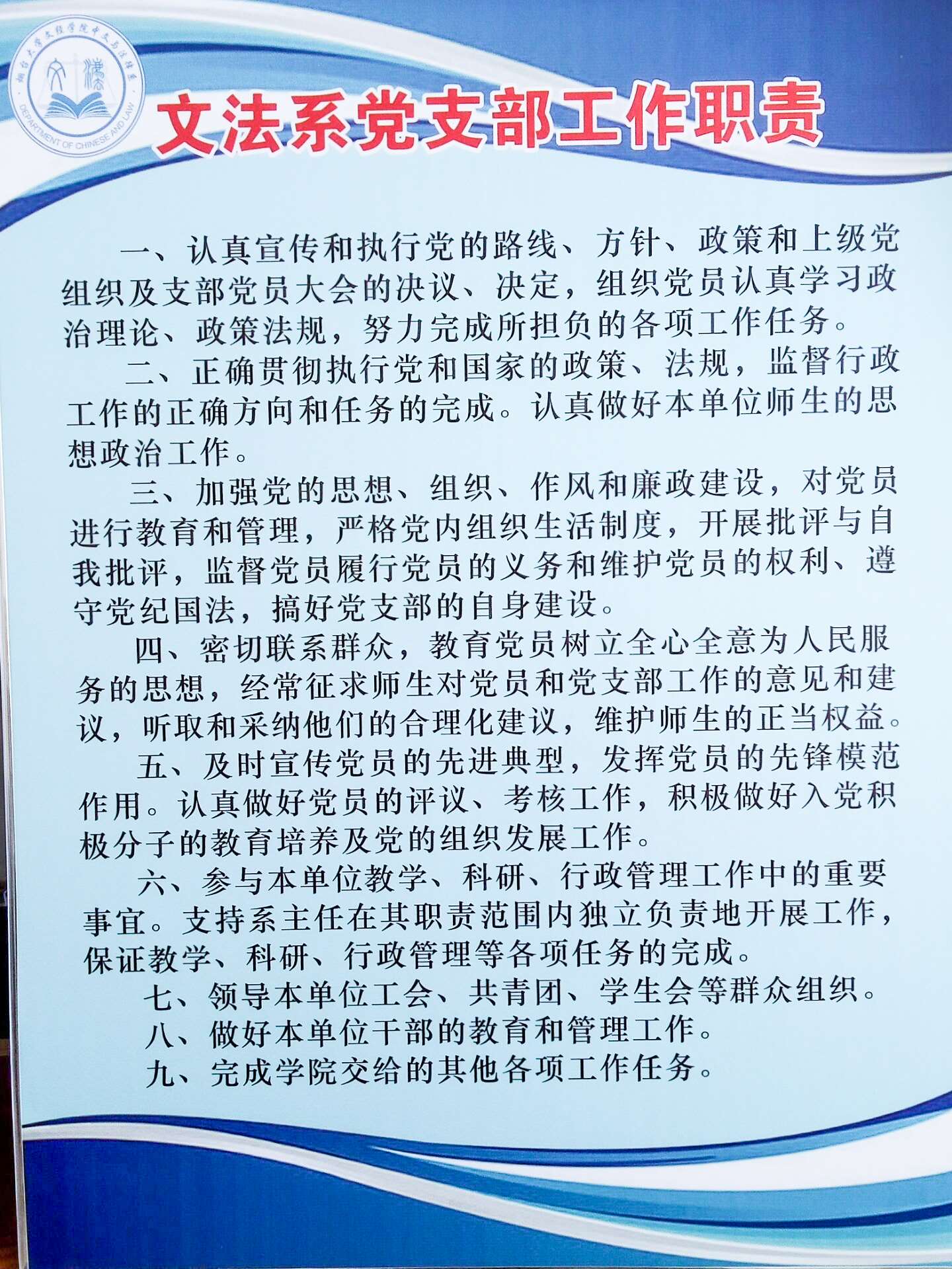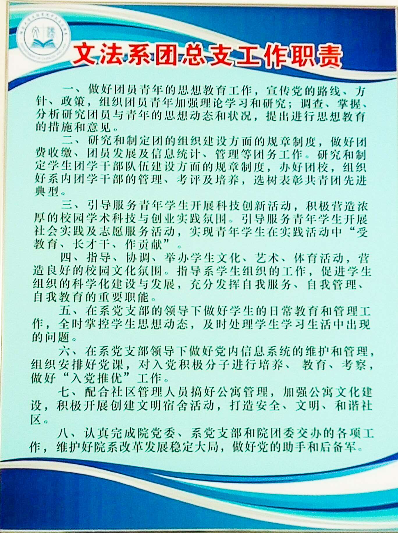 坚持不懈,努力创新。一直以来,我系高度重视本系的全面发展,秉承“崇文”、“求真”、“明法”的文法精神,制定了文法系党支部、团总支、辅导员、班主任等工作职责,严格按照校规校训进行管理,督促文法系广大师生做好各项工作,积极参加公司开展的各项活动。在党建工作方面上,我系在传播当声音的基础上,进一步存进公司党建工作的深入开展;在社区管理、员工工作以及社会实践方面,我系始终坚持公司教育方针,结合时代热点;在宣传工作方面,我系全面结合本系的专业特点,利用文法广大师生的优势,在全院的宣传工作中起带头作用。