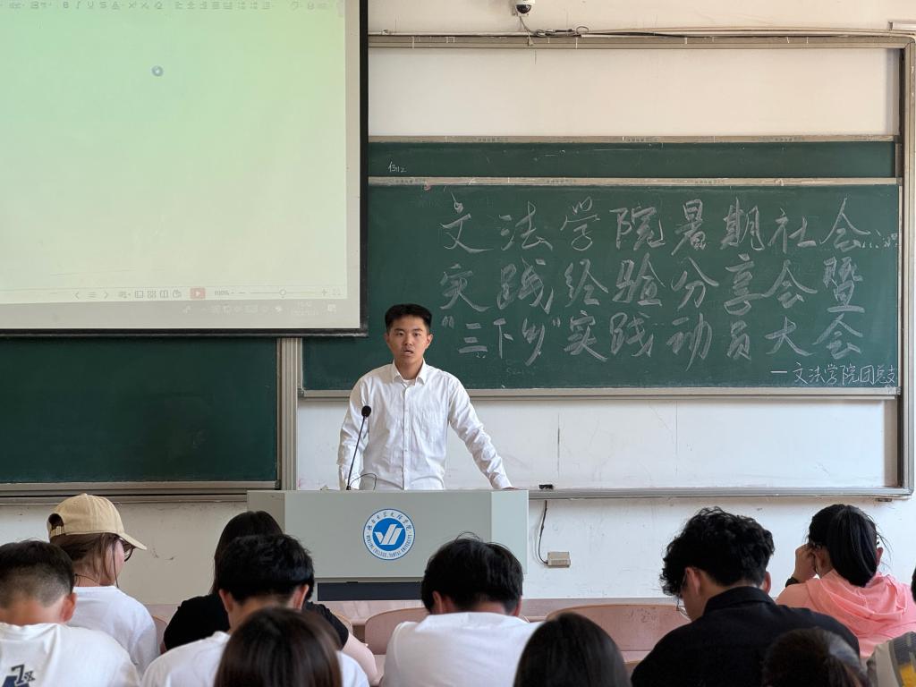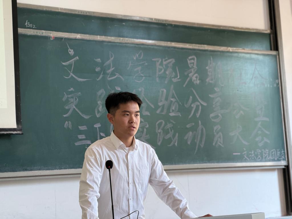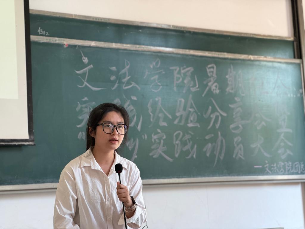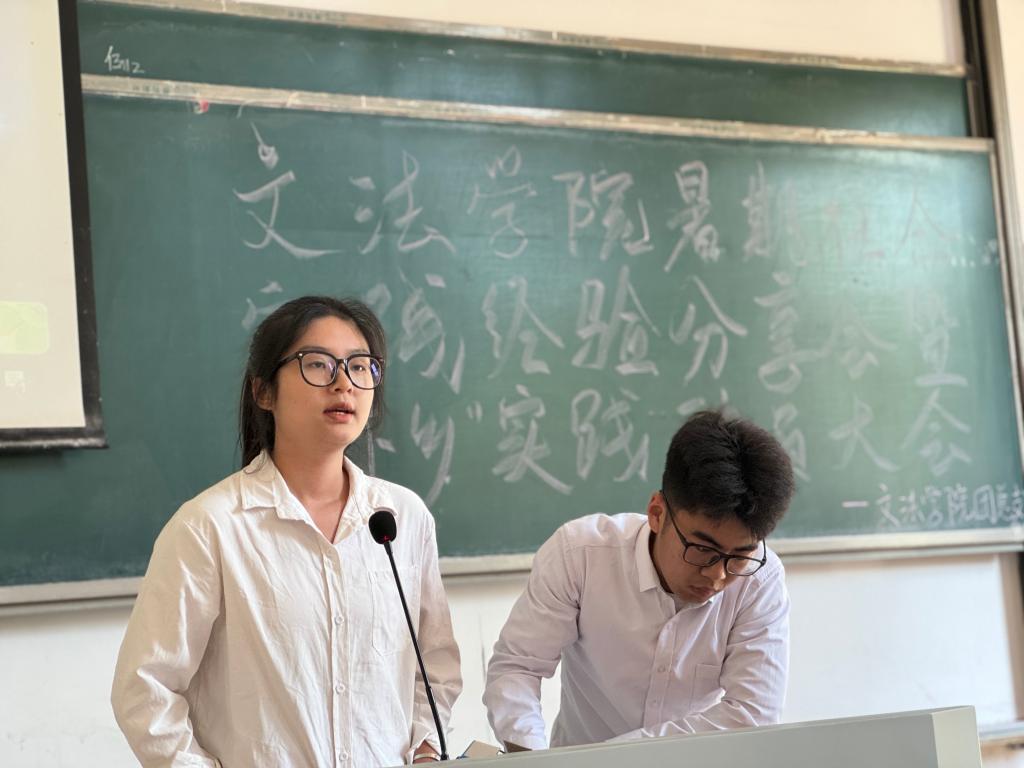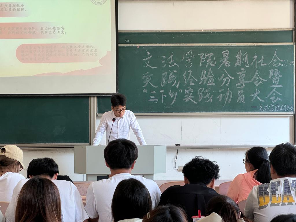 会议伊始,弘法沧澜实践队负责人赵怡晴向在场的同学们着重讲述社会实践的价值所在和实践经历。团队积极深入基层,开展实地调研,讲述在调研过程中队员了解基层群众法律需求的方式方法,并就针对实际问题提出切实可行的建议做出阐述。同时她强调了撰写文稿前要大量阅读新闻稿、实践内容要深入、答辩人员要口齿清楚等重要内容。她的分享让同学们受益匪浅。紧接着,如畾贯耳社会实践队负责人张润泽强调了社会实践对于老员工成长成才的重要性,鼓励同学们积极投身社会实践,将所学知识与实际相结合,不断提升自己的综合素质和实践能力。