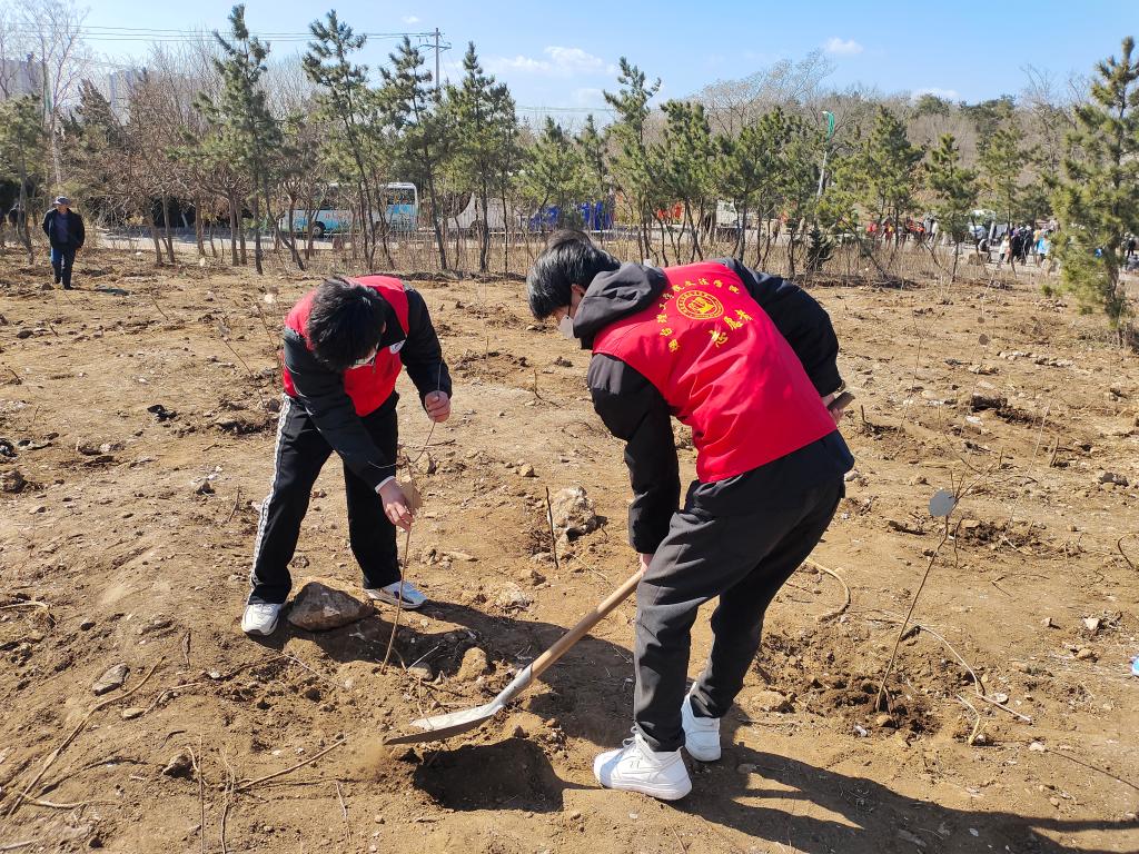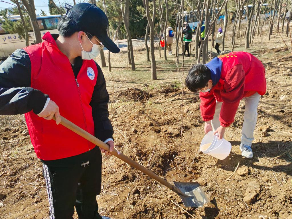 早春三月,草长莺飞。活动伊始,团员青年准时到达养马岛指定植树场地。在工作人员的组织领导下,公司团员青年与志愿者通力协作、互帮互助、分配工具、挖掘树坑、扶植树苗等一系列植树步骤有条不紊地展开。在每一个环节中,团学干部都活跃在前,为成员们提供了有效指导和帮助,体现了团员青年的模范带头作用。活动过程中,团员青年们就树苗栽培与生长知识与志愿者们进行了详细讲解。大家齐心协力,鼓足干劲,挥动铁锹,培土挖坑,种上一株株新苗;填土压实,为新苗筑基;提起水桶,为新苗浇灌水源。现场一派热火朝天的景象,一棵棵新栽的树苗生意盎然,为初春的烟台增添了一片生机勃勃的绿色,以实际行动展现了青年志愿者们爱护自然、倡导生态文明的新风尚。活动最后,成员们在树枝上挂上写有寄语的标示牌,祝愿树苗茁壮成长。