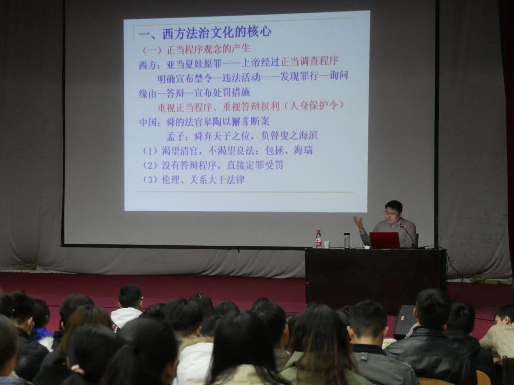 为贯彻落实党的十九大精神,积极响应依法治国战略,追寻名师足迹,触碰时代法治前沿。3月9日晚,文法系于一教207举办“法治精神关键词的历史开展”讲座,特邀华东师范大学法公司副教授任海涛担任主讲人,教务部部长董新红出席,讲座由法学教研室主任吴淑霞主持,文法系全体法学师生聆听了讲座。