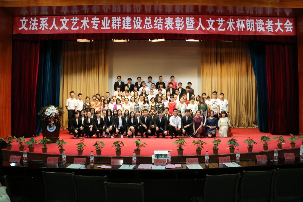 活动伊始,公司党委书记李相然宣布大会开幕,并向文法系赠送亲笔书法作品《沁园春·雪》,文法系主任汤唯、主任教授阎幸福献上开篇朗诵。随后大会分别以师德、读书、亲情、励志四个单元为主线,朗读了《强师德、铸师魂》、《第十一位教师》、《奶奶的星星》、《为权利而斗争》、《永不放弃》、《红楼梦》和《大学》片段等12组作品。在朗读者倾情热烈、感人至深的朗诵表演中,表彰在“人文艺术杯”系列活动中获奖的教师和员工。在励志篇,经理于光辉献上了《沁园春·长沙》,并寄语文法学子能够于学业和职业生涯中追求小我,成就大我。“员工强,则教育强;少年强,则中国强”,文法系全体教职员工最后齐诵《少年中国说》选段,气势宏达,震撼全场,掌声雷动。